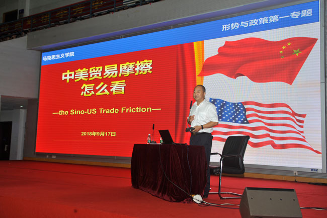 近日,我校党委委员、纪委书记于林惠应马克思主义学院邀请,围绕当前中美贸易摩擦的热点问题,为2018级新生讲授形势与政策课“中美贸易摩擦怎么看”专题,引导学生正确认识中国发展与当前的国际形势。