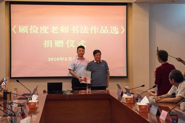 5月18日下午,我校在行政楼辅楼一楼会议室举行《顾俭度老师书法作品选》捐赠仪式。学校校长谢永华、校友会常务副会长尤建国、副校长崔新明,校友会副秘书长丁双玲和谭建华,各地校友会会长、秘书长代表参加了捐赠仪式。
