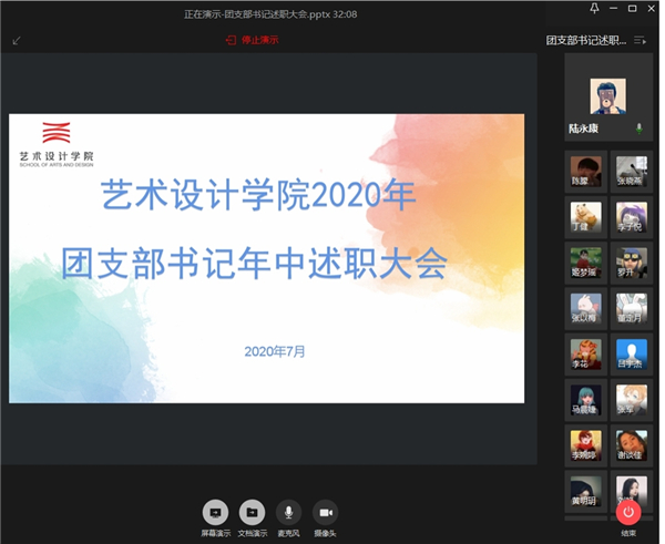 为深入实施“磐石工程”,落实团支部工作清单制度,加强艺术设计学院团支部书记队伍建设,激励团支部书记发挥模范先锋作用,增强基层团组织的凝聚力和战斗力,根据团省委《关于开展全省团支部书记“双述双评”工作,扎实推进“学习习近平总书记讲话,做合格共青团员”教育实践深入开展的通知》及团中央《关于在全团实施“青年大学习”行动的方案》要求,7月6日,艺术设计学院团总支通过企业微信线上会议平台,召开了艺术设计学院2020年团支部书记年中述职大会暨青年大学习表彰大会。艺术设计学院团总支书记陆永康、团总支学生干部以及大一、大二各团支部书记参加了本次会议。