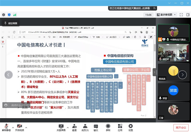 本次会议进一步推进了我校与中国电信集团有限公司的结对共建工作,双方将在会后持续做好沟通对接,共同做好大赛宣传工作,积极组织学生参与大赛,纳入中国电信集团有限公司科创人才库,争取让更多参赛学生获得就业面试绿卡,助力学生创业就业。